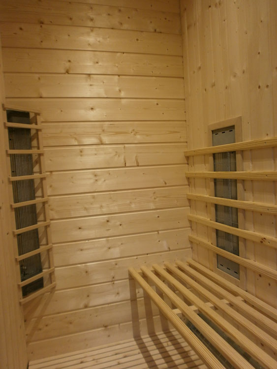 Lampe infrarouge au bourrage d'oxyde de magnésium 500 watts pour exposition de la face ou de dos comprenant un récepteur d'aluminium floqué avec 95 % de réflexion et une grille de protection satinée en couleur standard rouge, existe en brun ou gris clair sur demande.