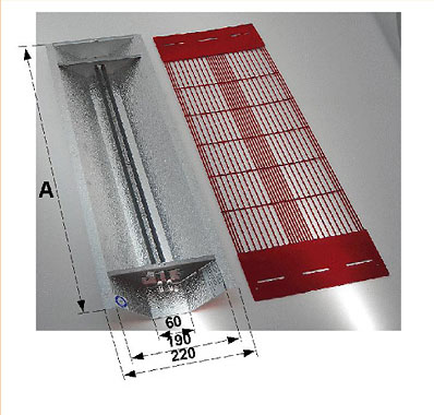 Lampe infrarouge au bourrage d'oxyde de magnésium 650 watts pour exposition de la face comprenant un récepteur d'aluminium floqué avec 95 % de réflexion et une grille de protection satinée en couleur standard rouge, existe en brun ou gris clair sur demande.