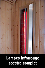 - L'installation de lampes infrarouges dans les angles de votre sauna infrarouge vous assure aussi une bonne répartition de la chaleur dans la cabine infrarouge.